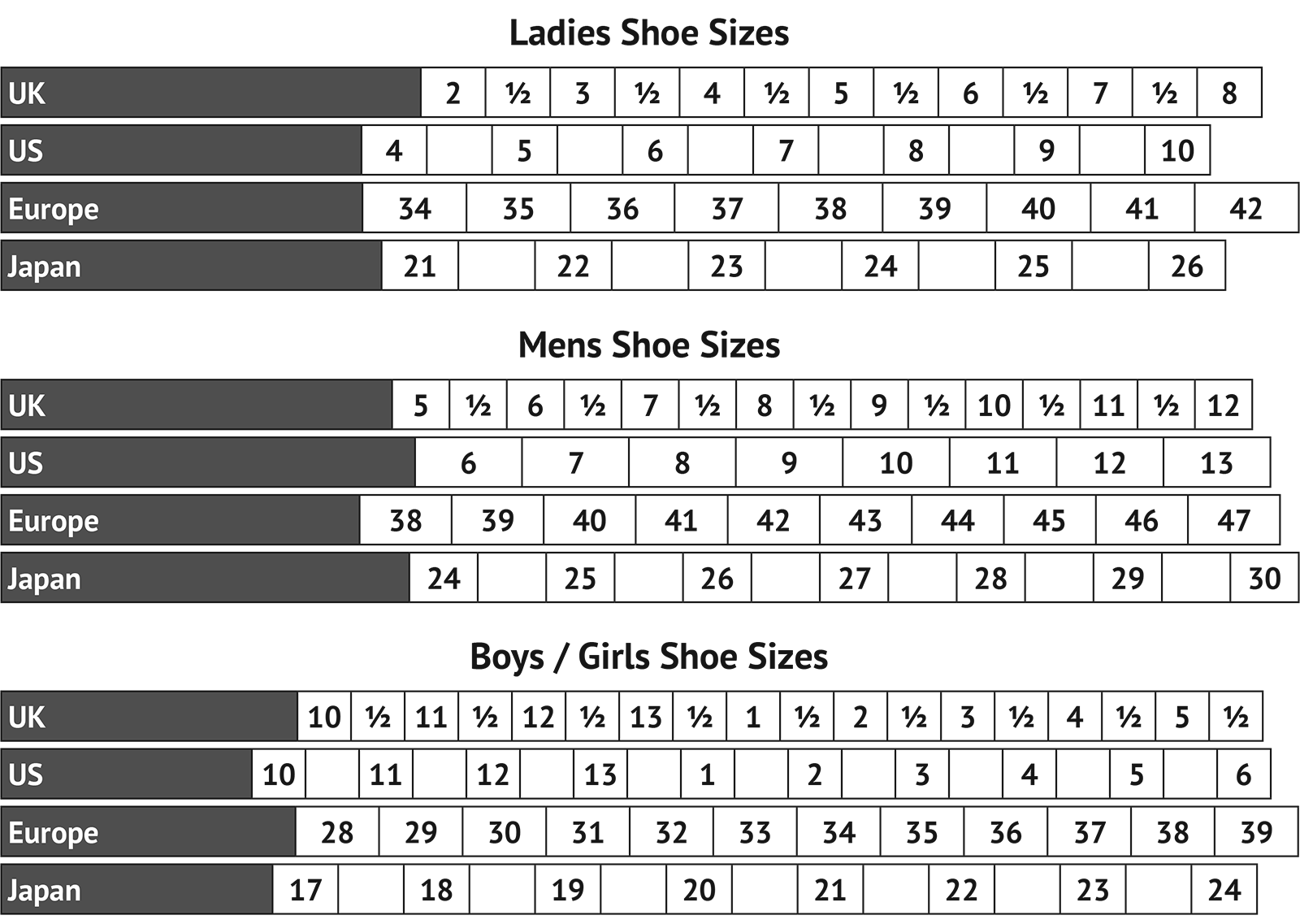 | UK | 11 | 11.5 | 12 | 12.5 | 13 | 13.5 | 1 | 1.5 | 2 | 2.5 | 3 | 3.5 | 4 | 4.5 |